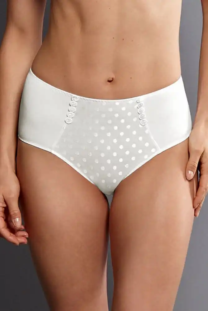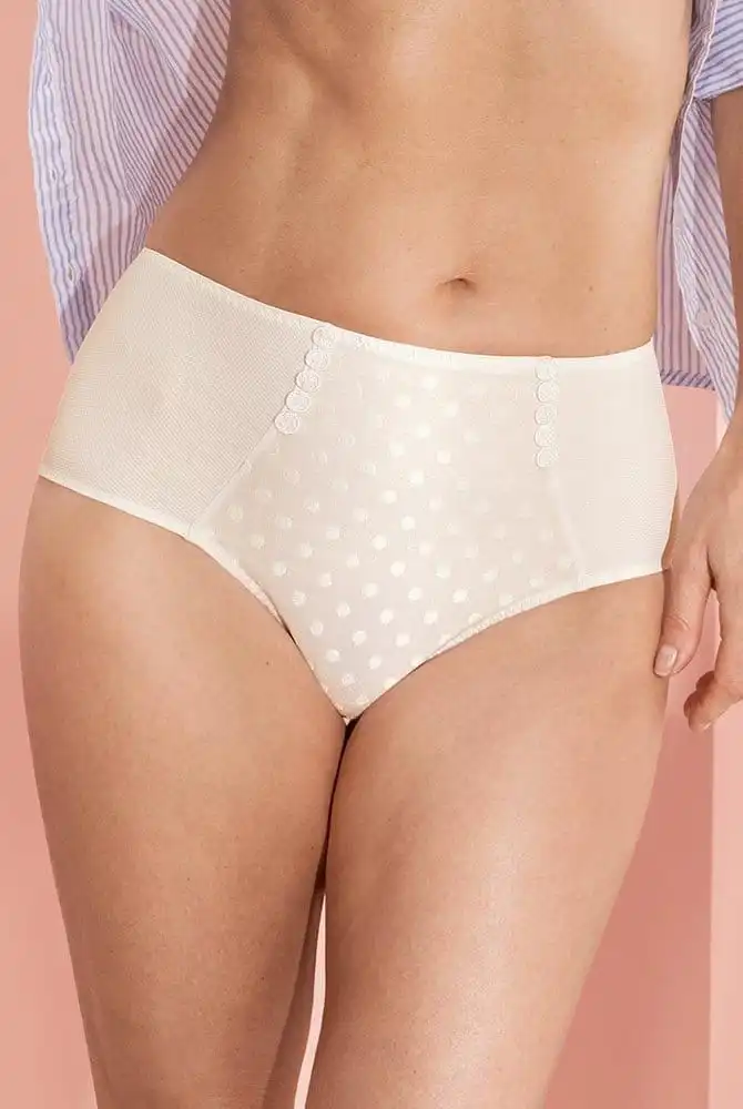 Der bequeme und hoch geschnittene Slip der Serie Airita von Qualitätsmarke Anita vereint Luftdurchlässigkeit und Tragekomfort. Im Vorderteil befindet sich eine modellierende Patte aus weichem Punkte-Jacquard-Stoff, die seitlich von zarten Stickerei Bändern geschmückt wird. Die Rückseite ist glatt und formschön gestaltet, so dass sich nichts abzeichnet. Der Beinausschnitt ist moderat, so kann nichts verrutschen.