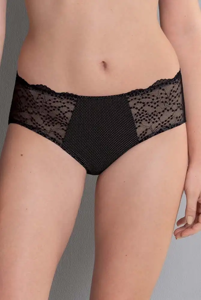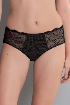 Modisch und detailreich vollendet der Taillenslip den bezaubernden Orely Dessous-Look à la française. Zarte Spitze mit verspielter Pünktchen-Stickerei greift der wunderschöne Slip mithilfe von seitlichen Einsätzen auf und sorgt damit für eine hinreißende Optik und einen Hauch Sinnlichkeit. Die weiche elastische Qualität schmiegt sich perfekt an Ihre Haut. Der Beinabschluss ist moderat. Der Bund ist hüfthoch geschnitten. Taillenslip Orely im Hipster Style ergänzt perfekt die BHs der Serie oder andere gleichfarbige BHs.