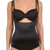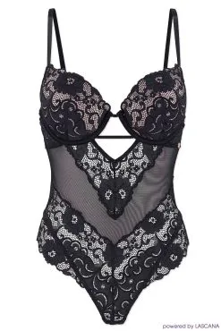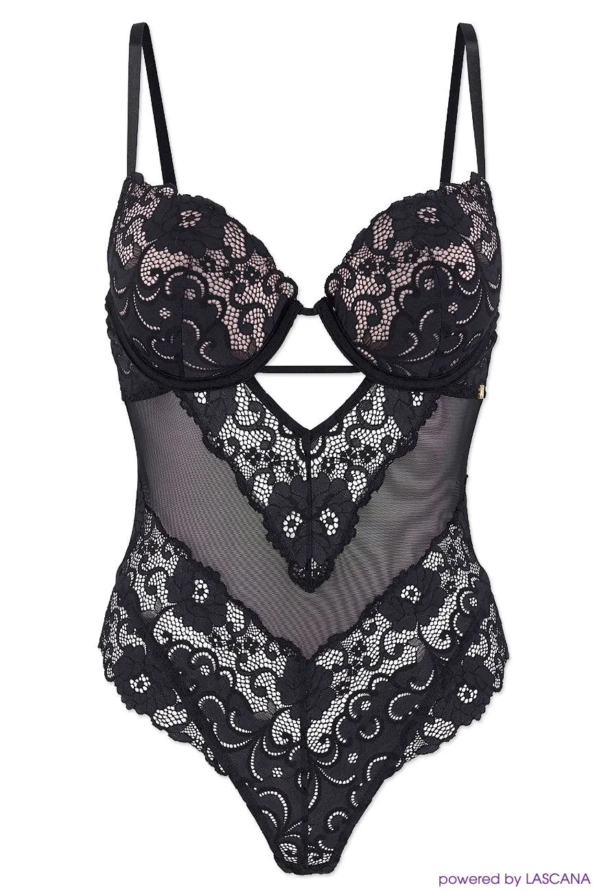 Stringbody aus feiner Spitze und leicht transparentem Mesh. Die hautfarbenen eingesetzten Cups sind mit Spitze überzogen. Mit einer Aussparung unter den Cups wird der Body zum Hingucker.