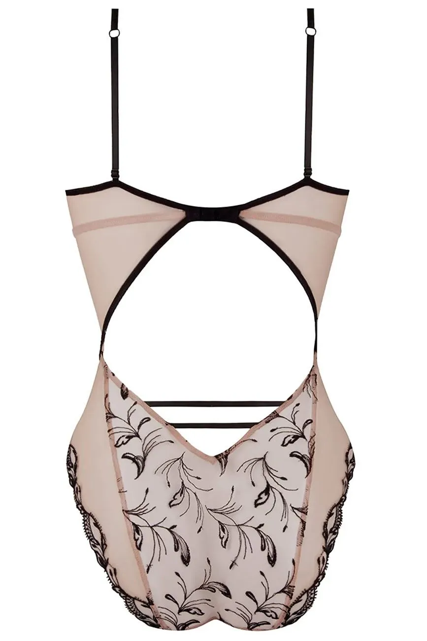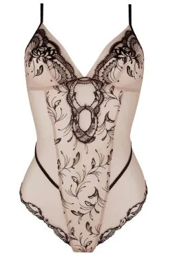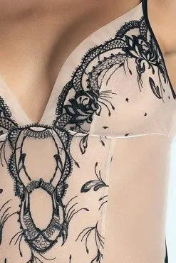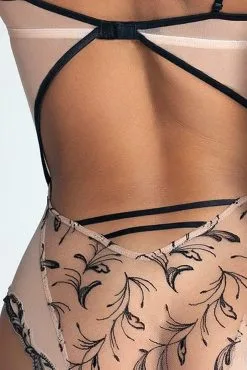 Luxuriöser Tattoo-Look von Lise Charmel. Edle Stickerei auf einem Hauch aus transparentem Micro-Mesh sorgen für einen atemberaubenden Look. Sinnlicher und edler Body ohne Bügel mit einer besonders raffinierten Bänderoptik die deine Figur betont, raffinierter Rücken und verstellbarer Rückenverschluss, im Schritt zu öffnen und mit Baumwollschrittfutter.