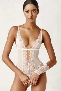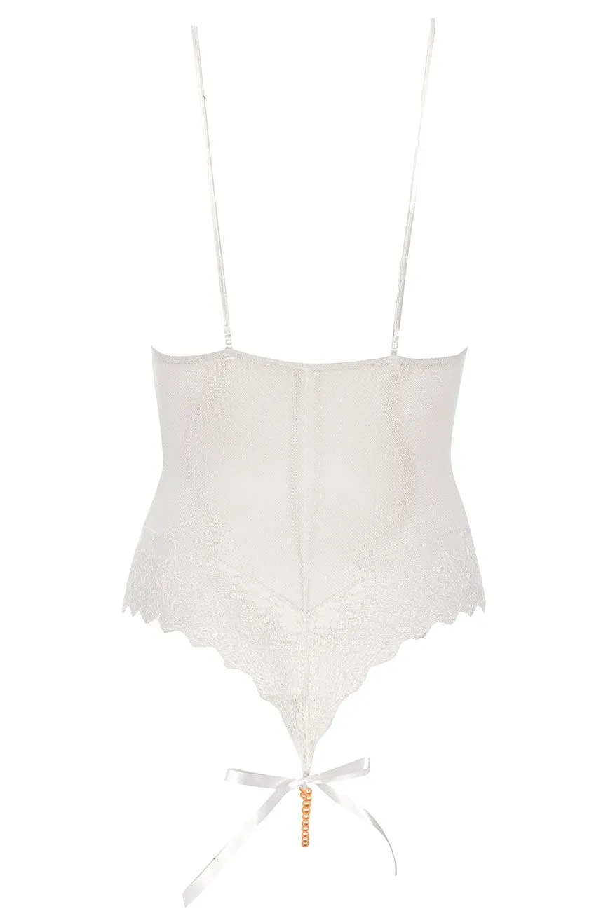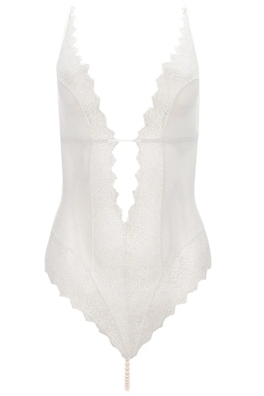 Sinnlicher Body-Ouvert aus herrlich zarter, transparenter Spitzengalone, verziert mit edlen Manacor-Perlen. Der besonders freizügige Schnitt mit tiefem Dekolleté und hohem Beinausschnitt betont die Silhouette. Die edle Manacor-Perlenkette führt durch den Schritt und ist im Rücken durch ein verspieltes Taftbändchen zu öffnen.