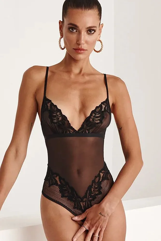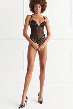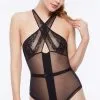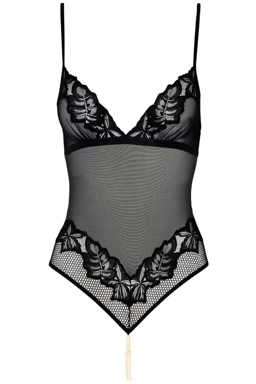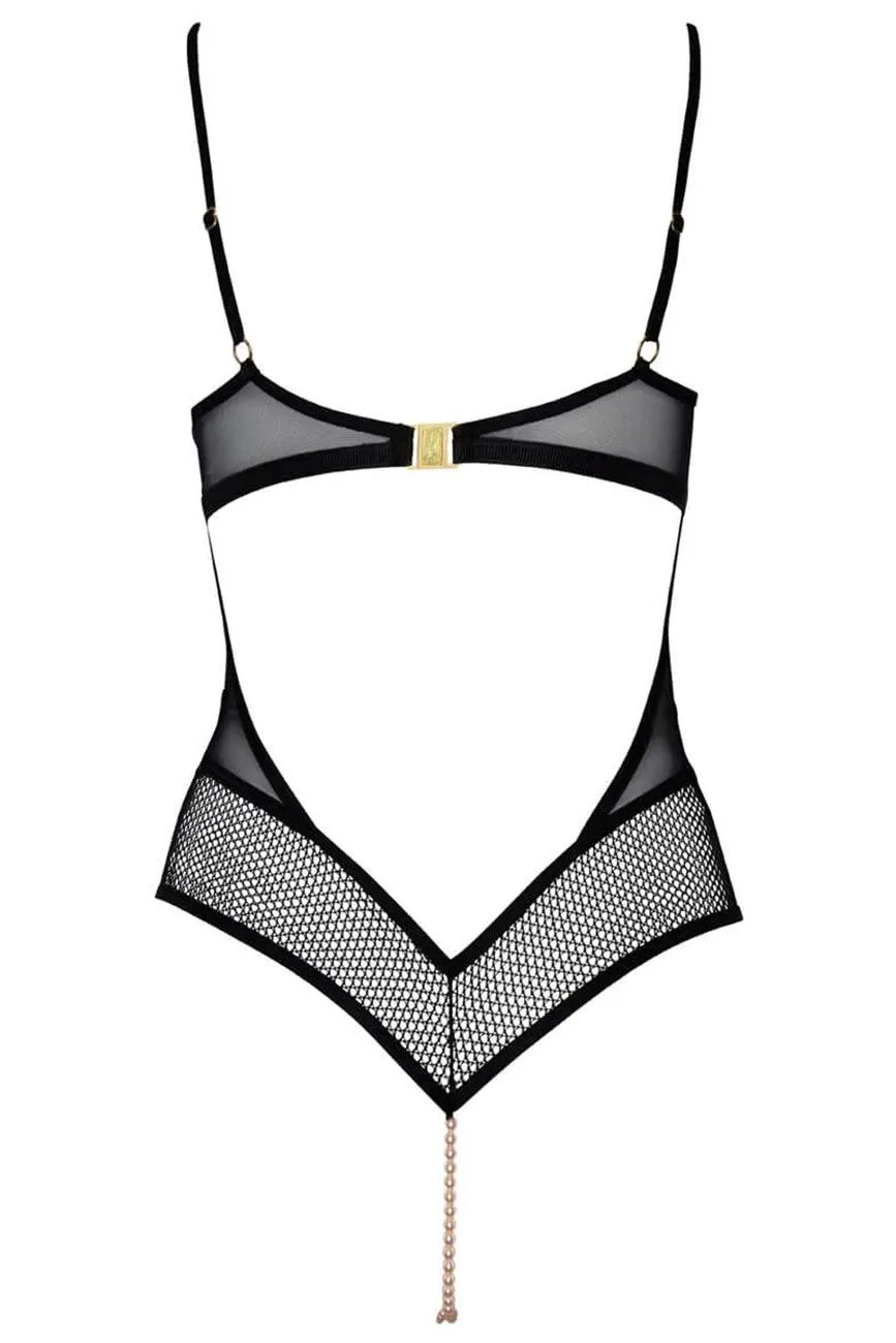 Extrem sinnlicher Body Ouvert von Bracli aus Leavers-Spitze, Tüll und goldenen Applikationen und einen tiefen und gewagten Rückenausschnitt. Die im Schritt fest eingenähte 2-reihige Perlenkette aus Manacor-Perlen sorgt für ein stimulierendes Gefühl und eine edle Zierung Ihres Intimbereichs.