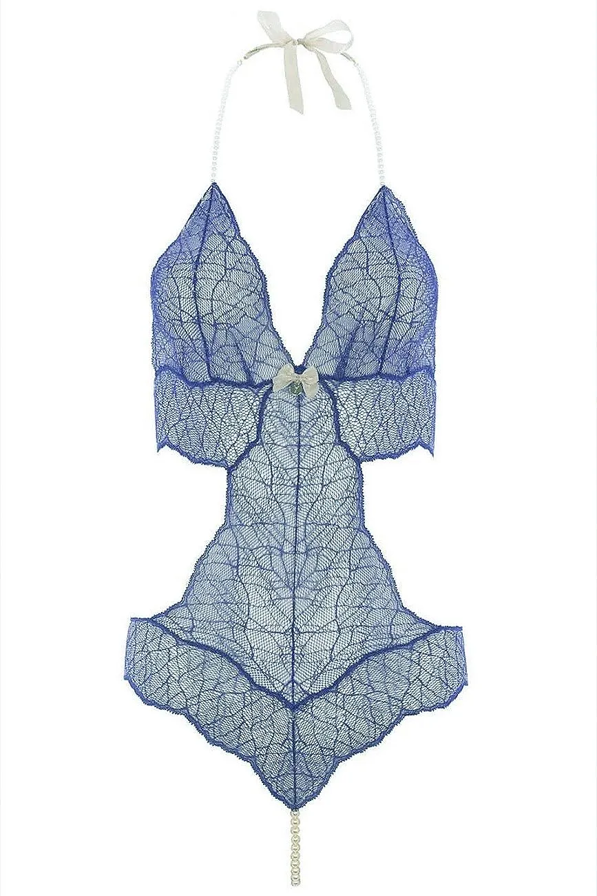 Body Ouvert aus feiner italienischer Spitze mit Lurex-Goldfaden und extravagentem Schnitt. Die luxuriösen Träger aus Manacor-Perlen sind im Nacken mit einem Satinband zu schließen. Die im Schritt fest eingenähte einreihige Perlenkette aus Manacor-Perlen sorgt für ein stimulierendes Gefühl und eine edle Zierung Ihres Intimbereichs.