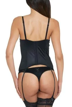 Edel und sexy! Verführerische Corsage mit Bügel aus weicher, elastischer Microfaser. Cups und Einsatz im Vorderteil aus besticktem Tüll in sinnlicher Transparenz. Die edle Guipure an den Cupseiten geht in die Träger über und endet an den kleinen Satinschleifen. Die vier festgenähten Strapse sind in der Länge verstellbar und werden von kleinen Schleifen geziert.