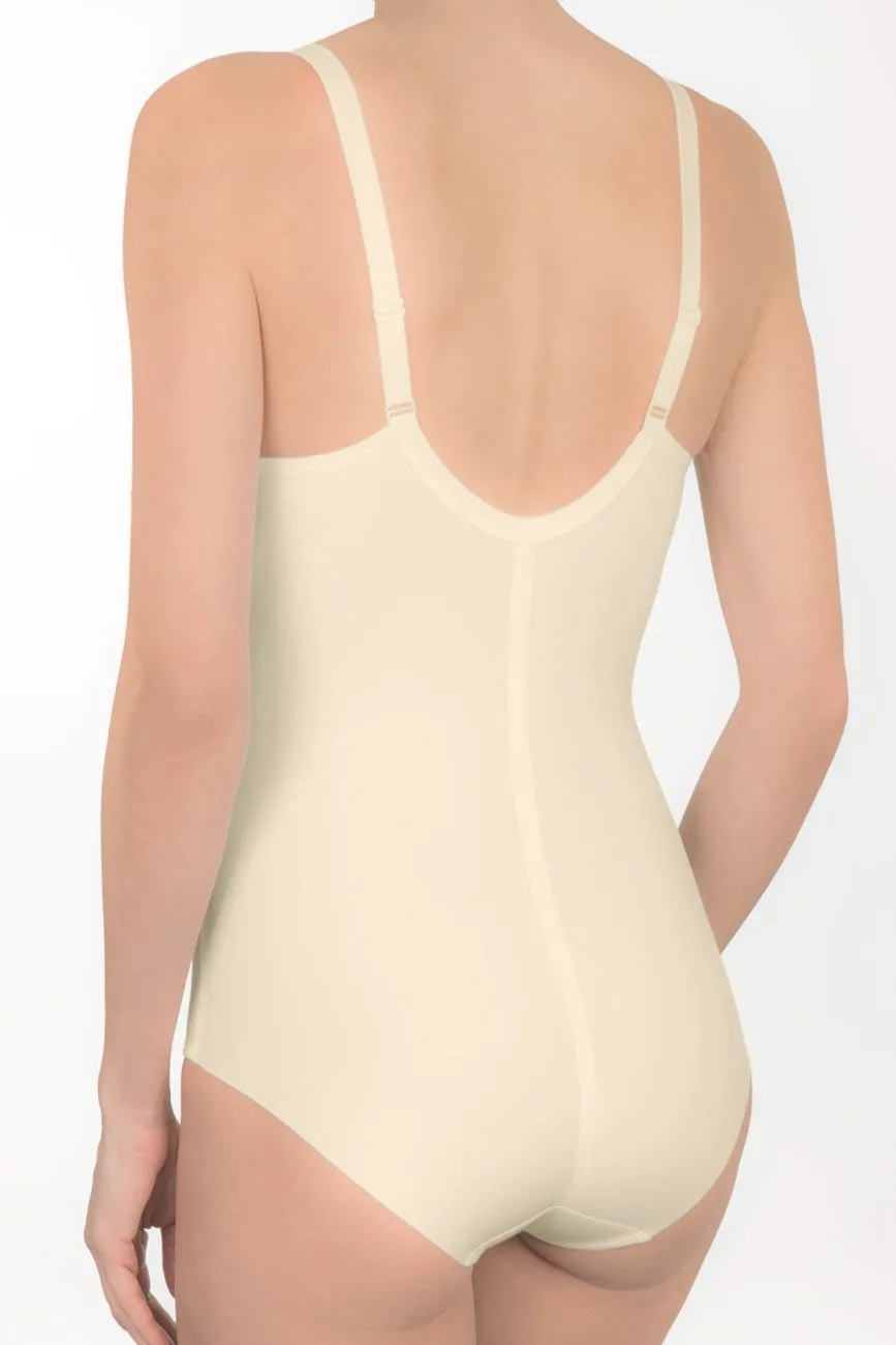 Für eine perfekte Silhouette ist der figurformende Body mit Bügel im Bauchbereich mit starkem, elastischem Tüll gefüttert. Der elastische Tüll mit stilvoller Stickerei am Obercup und die seitlichen Cupblenden sorgen für einen perfekten Halt und zaubern eine natürliche Büste. Hochwertige Schweizer Stickerei am Cupabschluss und den Trägern.