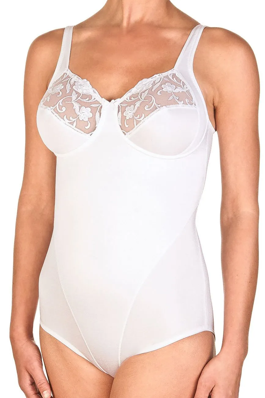 Mit diesem eleganten Body ohne Bügel machen sie immer eine gute Figur. Für eine perfekte Silhouette ist der Body im Bauchbereich mit starkem, elastischem Tüll gefüttert. Die seitlichen Cupblenden geben Halt und fließen in die Träger über – für ein natürliches aussehen der Brust. Der Obercup aus besticktem Tüll lässt die Haut zart durchschimmern. Eine dekorative Schleife ziert den Mittelsteg.