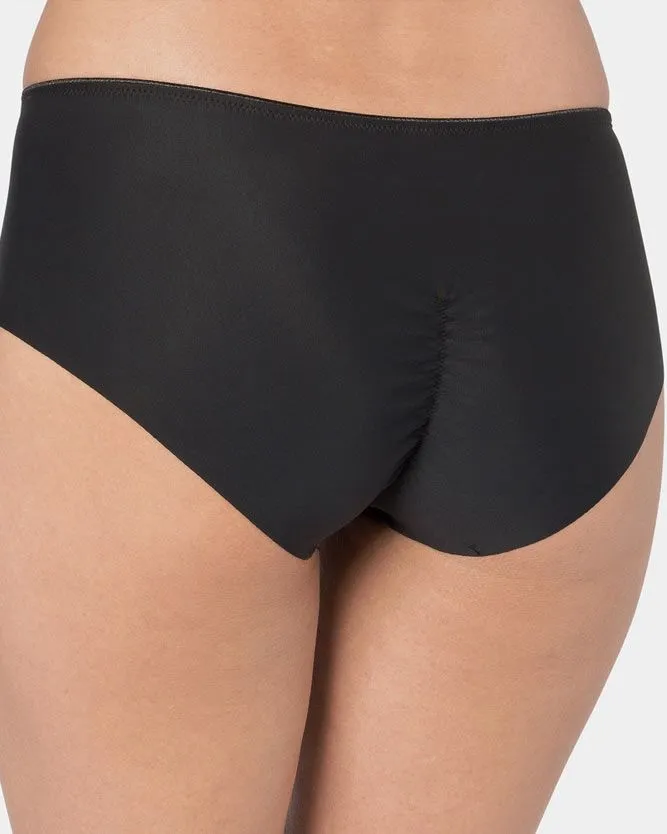 Zeitloser Hipster aus angenehmer Microfaser mit perfektem Tragekomfort. Edler Glanz-Druck in modischem Design im Vorderteil. Optimal unter enger Kleidung. Leichte Raffung am Gesäß.