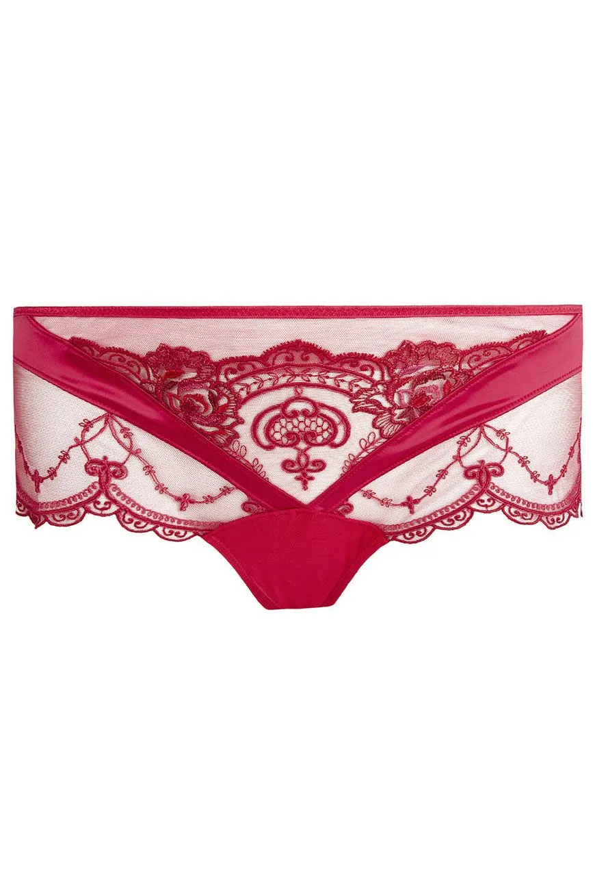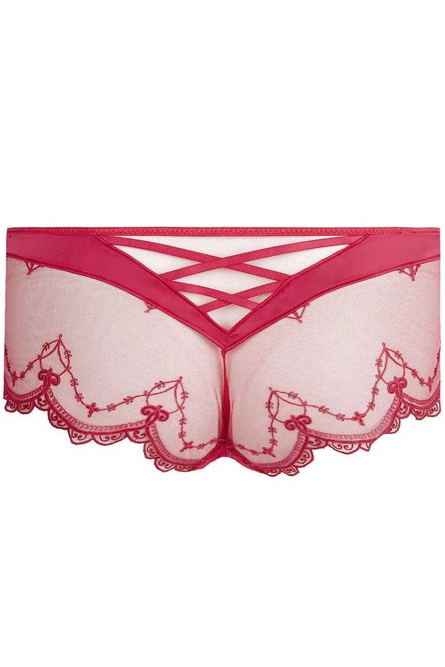 Luxuriöses Hotpants / Shorty von Lise Charmel, ganz aus wertvoller Tüllstickerei auf einem Hauch Tüll mit schimmernden Microsatineinsätzen und elastischer Schnüroptik hinten.