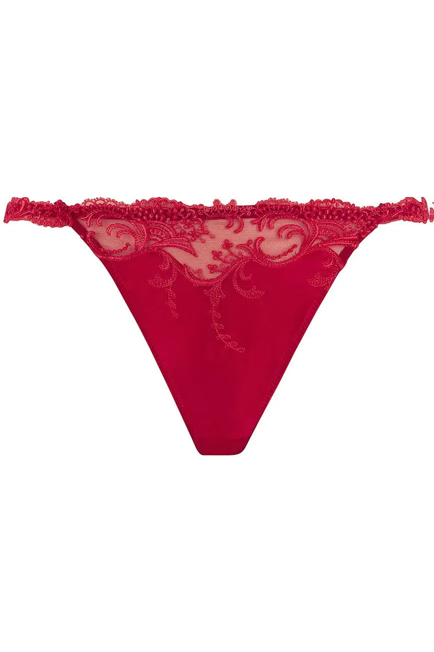 Verführerischer Mini-String mit optimalem Tragekomfort. Vorderteil aus kostbarer Satinseide und hochwertiger Leavers-Spitze. Für einen glamourösen Look sind die schmalen Seiten und der Bund im Rücken mit exclusiver Guipure verziert.