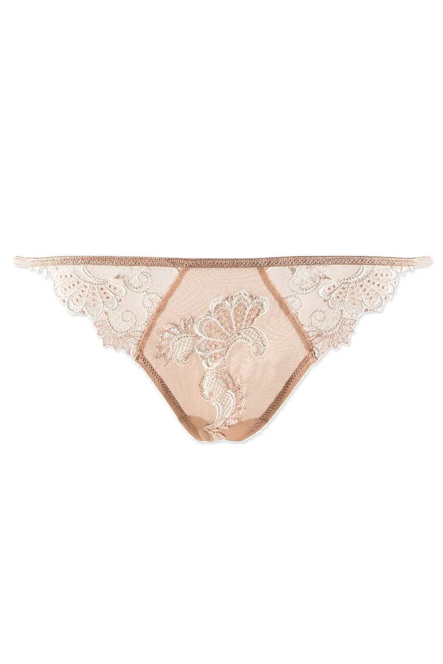 Sehr reizvoller und sinnlicher Mini-String mit schmalen Seiten. Ein besonderer Blickfang ist die kunstvolle Guipure-Spitze im Vorderteil, die sich auch im Rücken widerspiegelt. Die vordere Mitte ist blickdicht verarbeitet und wird zu den Seiten transparent.
