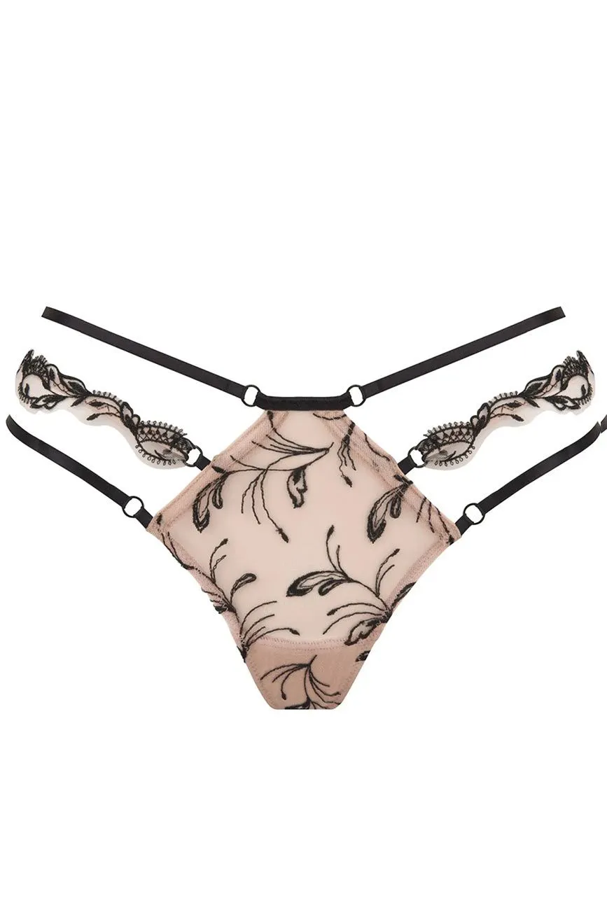 Luxuriöser Tattoo-Look von Lise Charmel. Edle Stickerei auf einem Hauch aus transparentem Micro-Mesh sorgen für einen atemberaubenden Look. Der sexy Mini-String mit verspielten Bändern und edler Stickerei ist herrlich reich verziert, mit Baumwollschrittfutter.