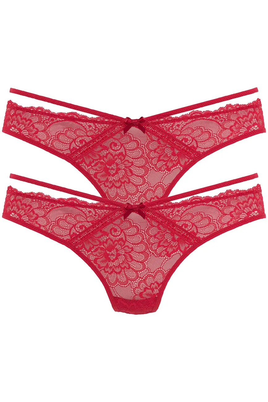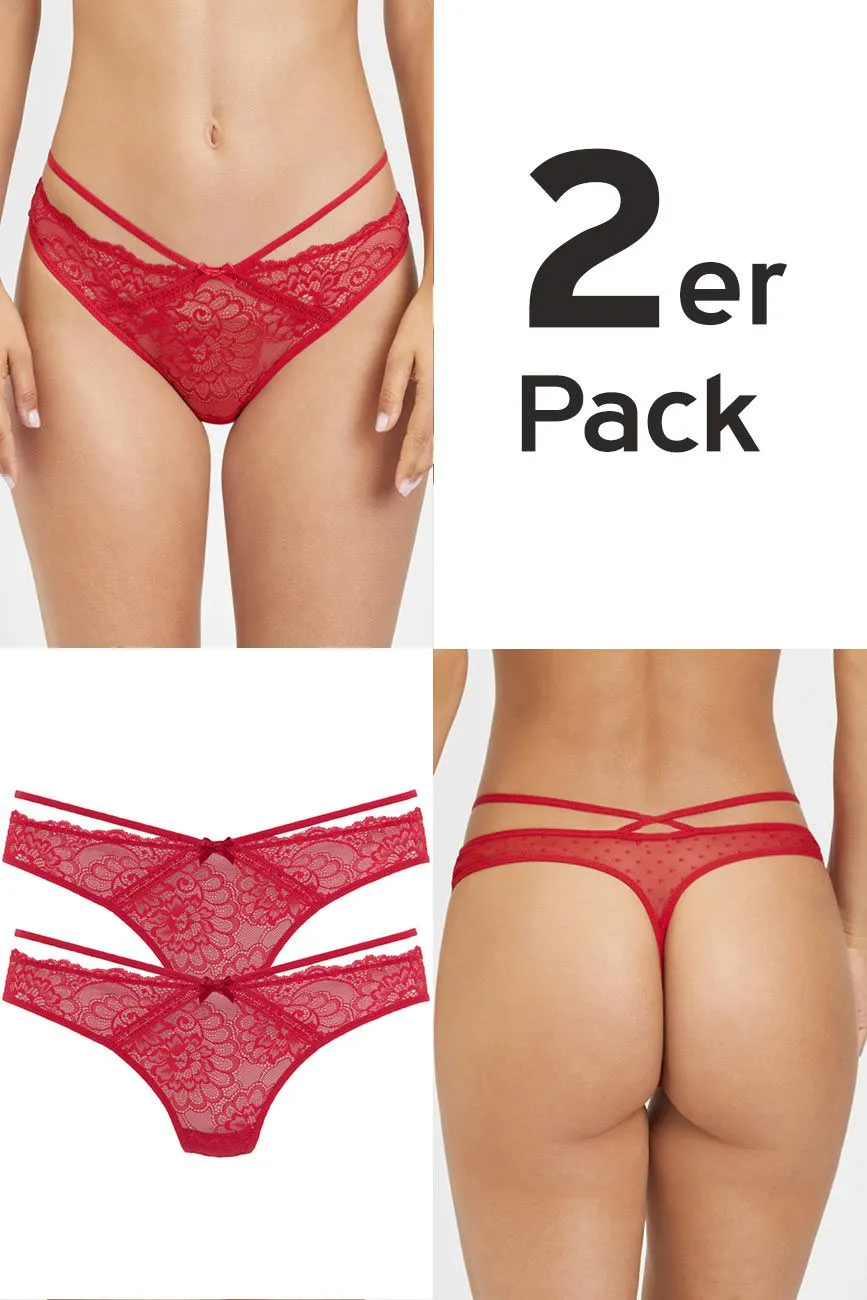 Sexy Strings aus Spitze mit Strapdetails im 2er Pack von Lascana. Die Strings mit verspielten Details verziert, hinten aus Netzspitze, vorne aus Blütenspitze, mit Baumwollschrittfutter. Perfektes Coordinate zur aktuellen Mode.