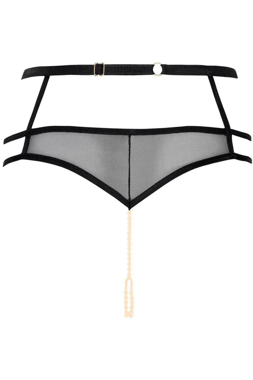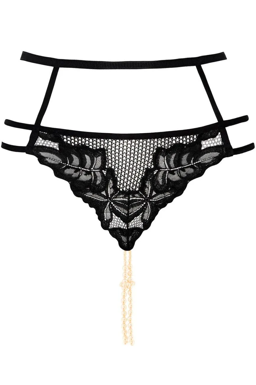 Extrem sinnliches Panty ouvert von Bracli aus Leavers-Spitze, Tüll, elastischen Satinbändern und goldenen Applikationen, mit denen das Kleidungsstück an jeden Körper angepasst werden kann. Die im Schritt fest eingenähte 2-reihige Perlenkette aus Manacor-Perlen sorgt für ein stimulierendes Gefühl und eine edle Zierung Ihres Intimbereichs.