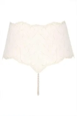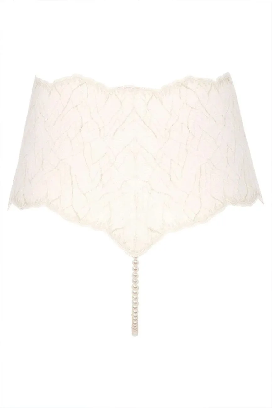 Edler Ouvert-Panty der Serie Bracli Sydney aus feiner italienischer Spitze mit Lurex-Goldfaden und verspieltem Schleifchen. Die im Schritt fest eingenähte 2-reihige Perlenkette aus Manacor-Perlen sorgt für ein stimulierendes Gefühl und eine edle Zierung Ihres Intimbereichs.