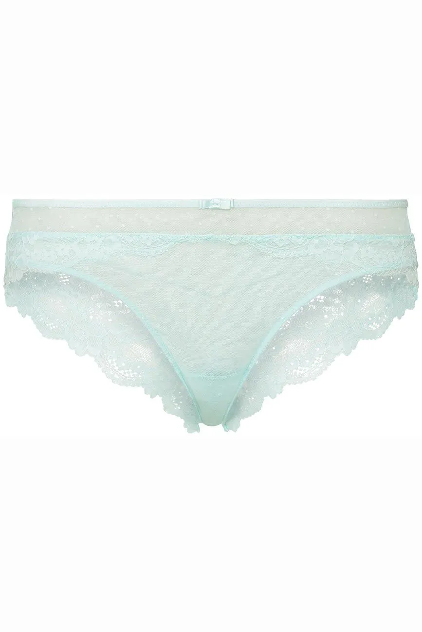 Panty aus wunderschöner floraler Spitze, sowie Pünktchen Mesh. Ein weiteres Highlight ist die kleine Zierschleife. Der eingearbeitete Baumwollzwickel sorgt zudem für optimalen Tragekomfort.