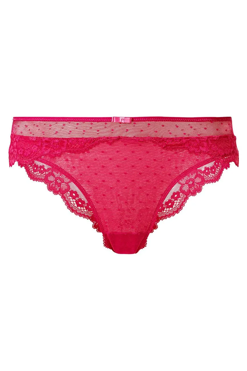 Panty aus wunderschöner floraler Spitze, sowie Pünktchen Mesh. Ein weiteres Highlight ist die kleine Zierschleife. Der eingearbeitete Baumwollzwickel sorgt zudem für optimalen Tragekomfort.