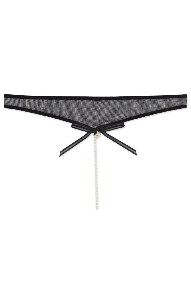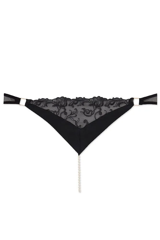 Knisternde Leidenschaft verspricht dieser erotische Perlen-Tanga aus feinem Netztüll in sinnlicher Transparenz. Das Vorderteil besticht durch eine luxuriöse Stickerei, den Einsatz aus edler Seide und rosegoldfarbenen Metallelementen an den Seiten. Seiten und Rücken sind mit elastischem Satin eingefasst. Stimulierende Perlen im Schritt, im Rücken abnehmbar.