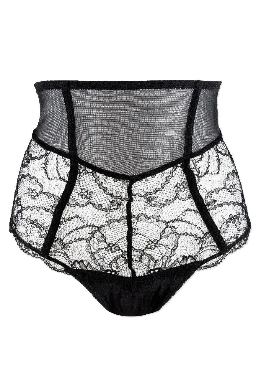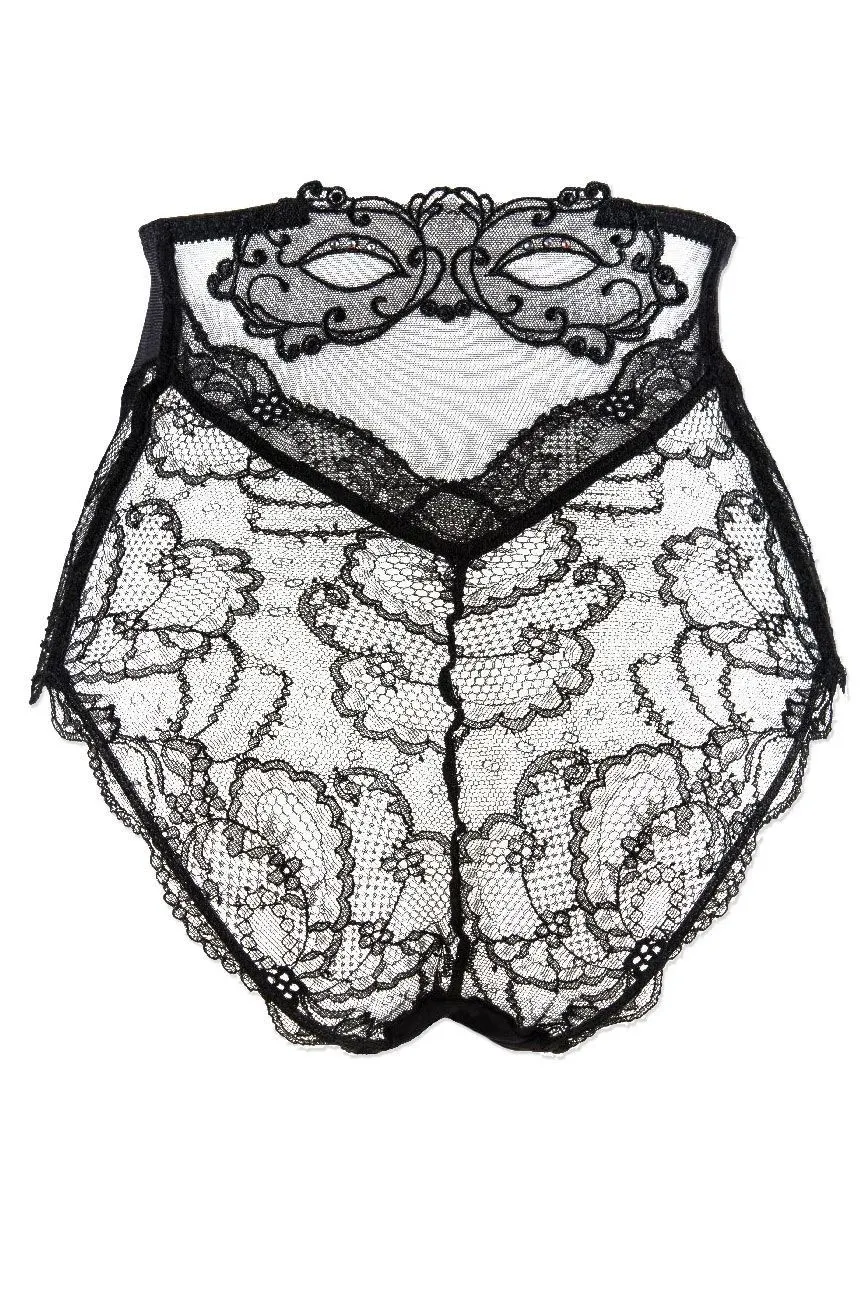 Retro Taillenslip in verfĂĽhrerischer Transparent. Der Slip ist komplett aus filigraner, arabesker Guipure-Stickerei kombiniert mit hauchzarter Leavers-Spitze und funkelnden Swarovski-Steinchen verarbeitet. Raffinierte RĂĽckansicht.