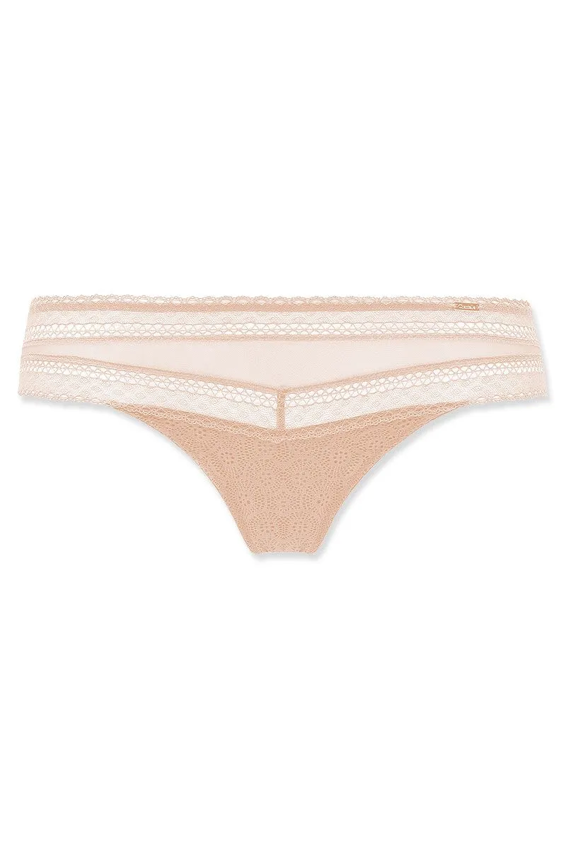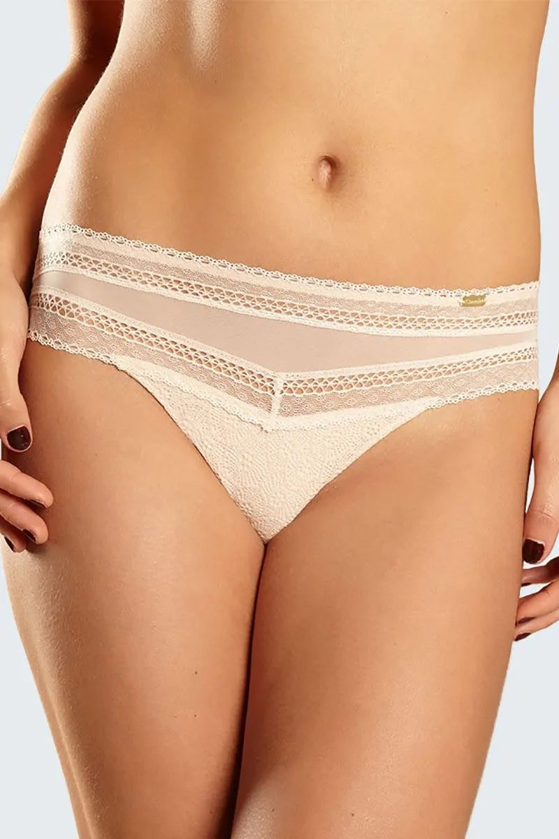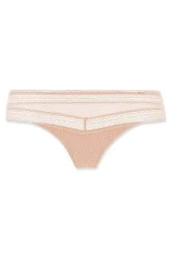 Verführerischer Rio-Slip in modernem Design. Slip aus feinem, elastischem Tüll in zarter Transparenz. Die Spitzenbordüre entlang des Beinausschnittes und der Hüfte und die Spitzeneinsätze im Vorder- und Rückenteil verleihen einen romantischen Look.