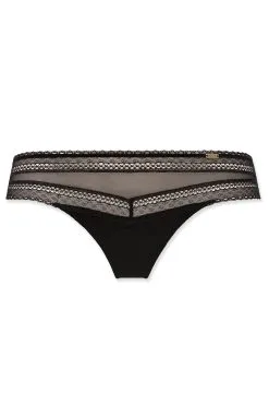 Verführerischer Rio-Slip in modernem Design. Slip aus feinem, elastischem Tüll in zarter Transparenz. Die Spitzenbordüre entlang des Beinausschnittes und der Hüfte und die Spitzeneinsätze im Vorder- und Rückenteil verleihen einen romantischen Look.