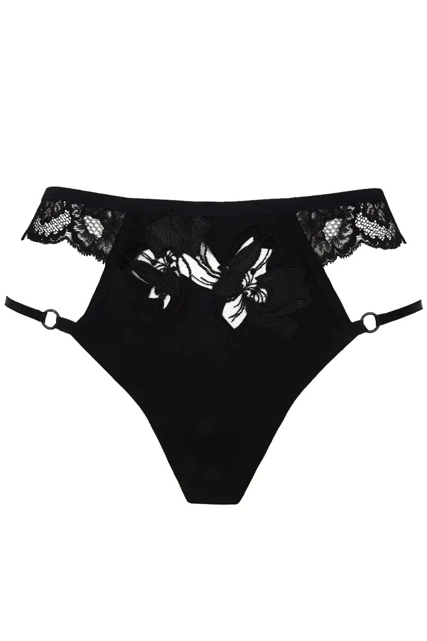Extravagant – luxuriös – sexy: transparentes Mesh mit edler BlĂĽtenstickerei, die BlĂĽtenblätter sind aus effektvollem Lederimitat gearbeitet. Sexy String mit raffiniert verzierten Bändern.