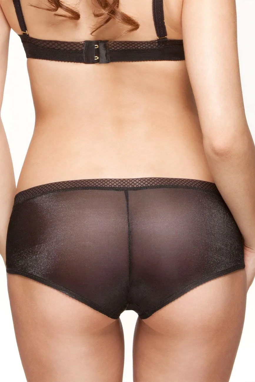 Edle Shorty aus zart schimmerndem Tüll in sinnlicher Transparenz. Die dezente Borde an den Abschlüssen verleiht einen femininen Style. Ein goldenes Logo ziert das Vorderteil. Shorty mit Baumwollzwickel.