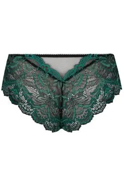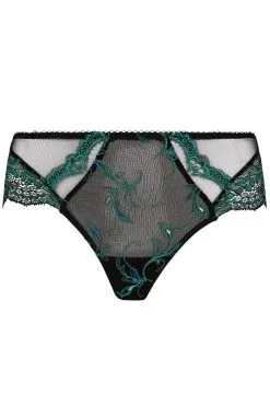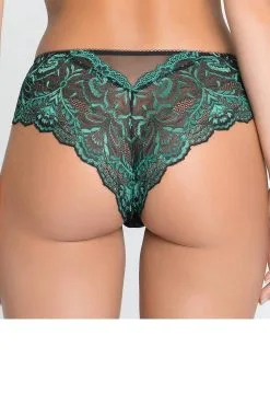 Edle Shorty von Lise Charmel. Das Material ist extrem feines, transparentes Gewebe mit wertvoller Stickerei in Smaragd und Blau verziert, weiche Spitze an den Säumen. Detailverliebte, geometrische Verarbeitung ist die höchste Kunst der Haute Couture.