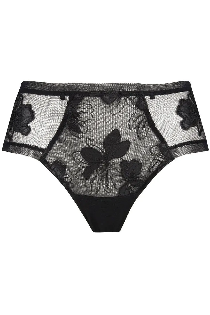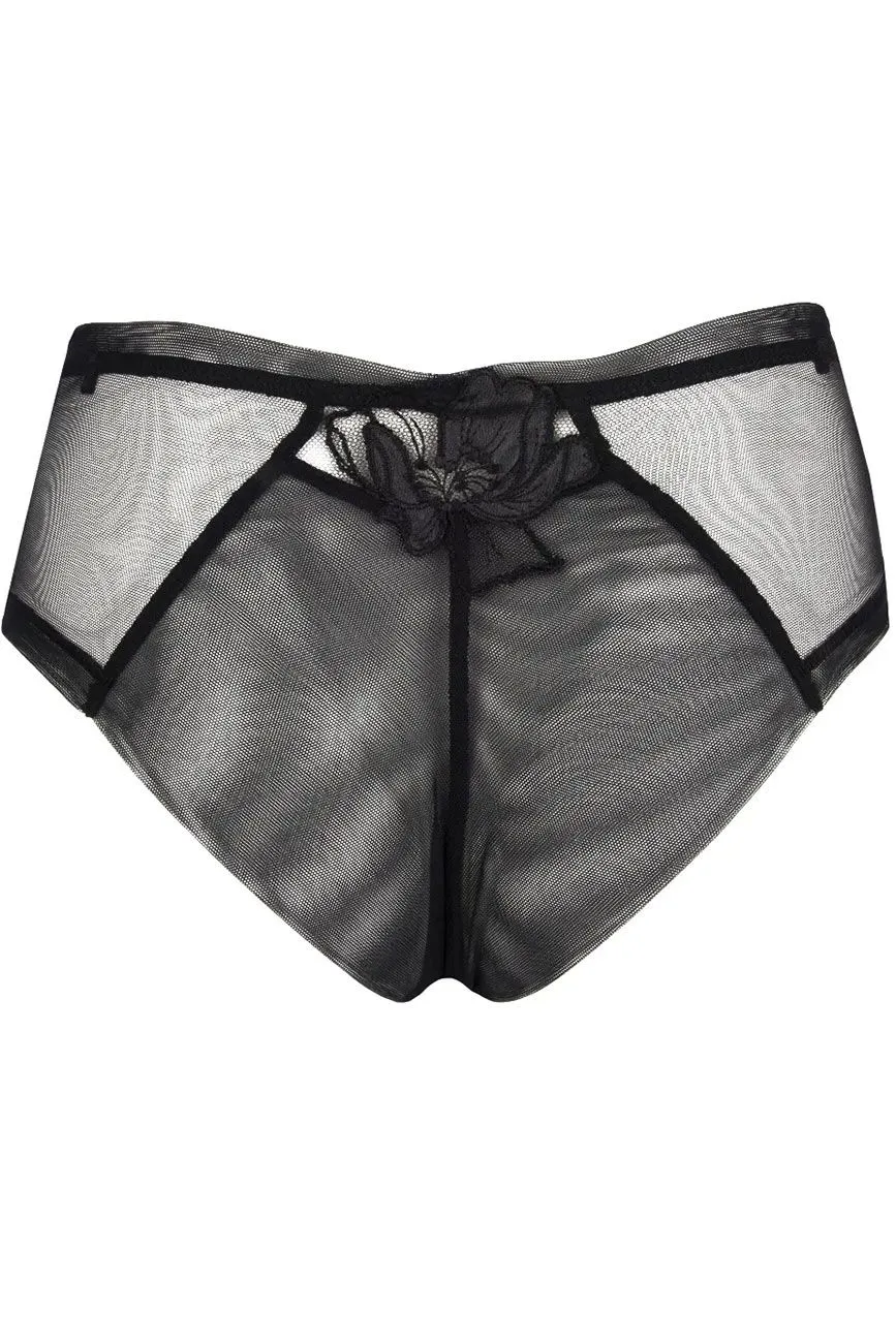 Extravagant – luxuriös – sexy: transparentes Mesh mit edler Blütenstickerei, die Blütenblätter sind aus effektvollem Lederimitat gearbeitet. Shorty ganz aus transparentem Mesh, vorne und im Rücken reich verziert.