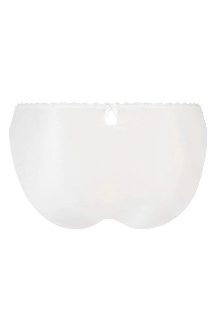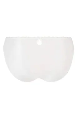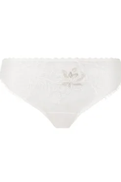 Fantasievoll gestalteter Slip von Lise Charmel aus edler Blütenstickerei, Chantilly Spitze und zartem Mesh. Blüten-Stickerei mit schimmerndem Lurex-Goldfaden, elastischer Bund, Zwickel aus reiner Baumwolle, Perlmutt-Hüllengarantie gegen Gelbfärbung durch UV-Einfluß.