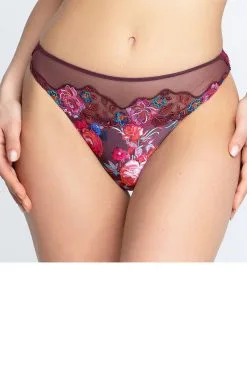 Edler Slip Verführung von Lise Charmel aus kostbarer, bedruckter Seide und mit bunten Blüten besticktem Tüll. Die Rückseite ist mit einer dezenten Stickerei an den Säumen und einem Einsatz aus Seide verziert.