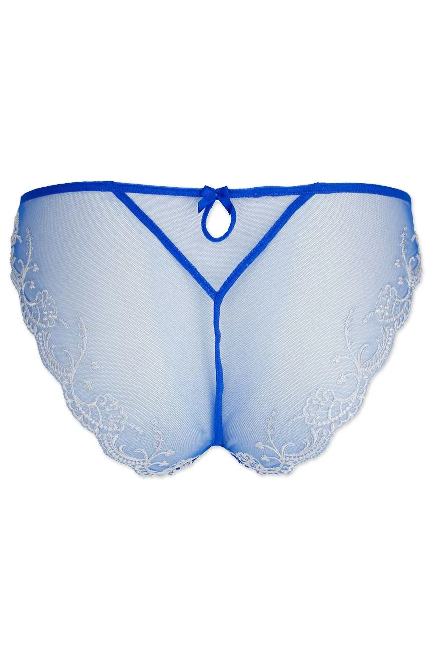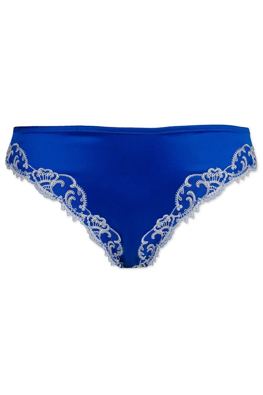 Verführerischer Slip mit perfektem Tragekomfort. Blickdichtes Vorderteil aus kostbarer Satinseide. Rücken aus gedoppeltem Tüll mit raffinierter tropfenförmiger Öffnung und kleiner Satinschleife. Am Beinausschnitt mit kontrastfarbiger Stickerei schmeichelhaft veredelt.