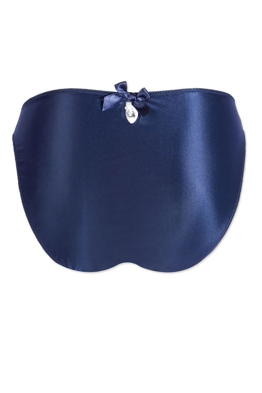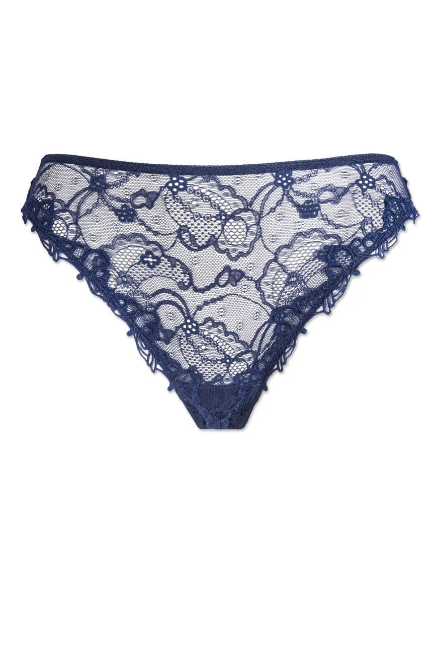 Der verführerische Slip ist im Vorderteil aus filigraner, arabesker Guipure-Stickerei kombiniert mit hauchzarter Leavers-Spitze und funkelnden Swarovski-Steinchen verarbeitet. Rückenteil mit dekorativer Schleife.