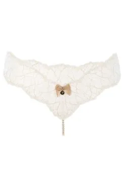 Edler Ouvert-String der Serie Bracli Sydney aus feiner italienischer Spitze mit Lurex-Goldfaden und verspieltem Schleifchen. Die im Schritt fest eingenähte einreihige Perlenkette aus Manacor-Perlen sorgt für ein stimulierendes Gefühl und eine edle Zierung Ihres Intimbereichs.