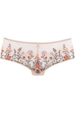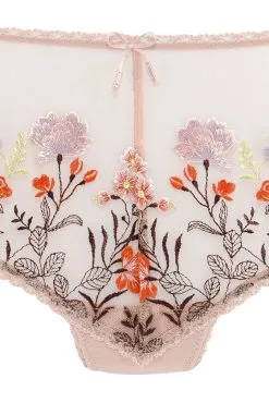 Feminine String-Panty mit wunderschönen Blumen aus edler Stickereispitze auf transparentem Mesh, verzierter Bund und Beinausschnitte, mit eingearbeitetem Baumwollzwickel.