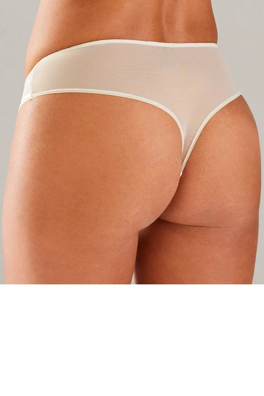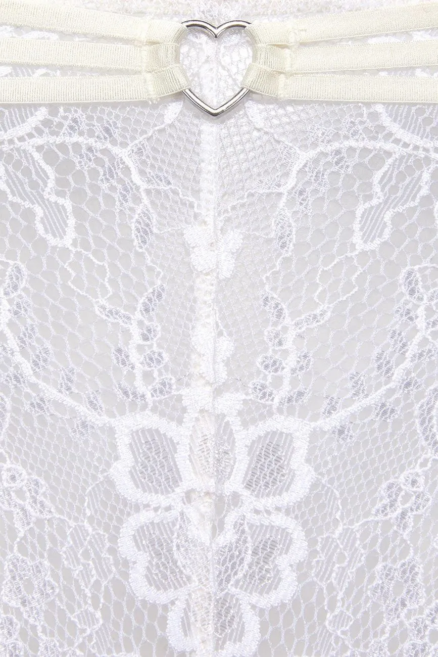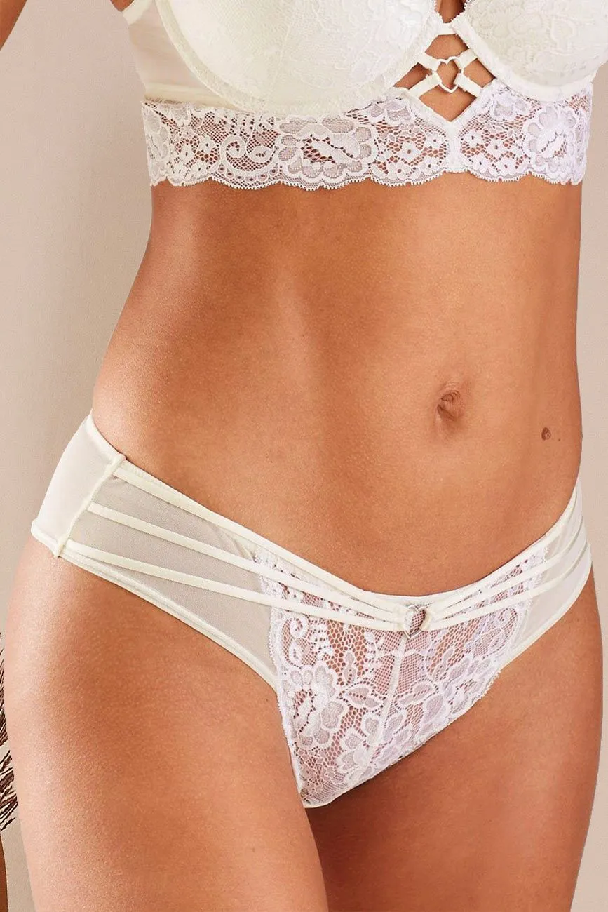 Stringpanty von Vivance, mit dekorativen Bändern und Herz-Accessoire vorn. Vorn aus zarter Spitze und leicht transparentem Mesh gearbeitet, hinten ist sie ganz aus leicht transparentem Mesh. Der Baumwollzwickel sorgt für ein angenehmes Tragegefühl.