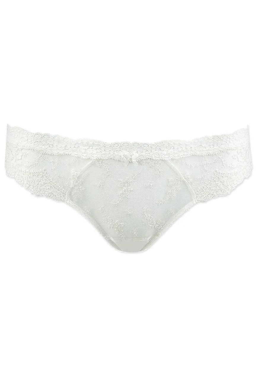 Sexy String-Tanga in sinnlicher Transparenz aus feinem Tüll in leuchtendem Perlmutt. Das Vorderteil besticht durch eine florale Stickerei die zusammen mit der hochwertigen Spitze an den Abschlüssen für eine romantische Note sorgt. Die Streifen aus Lycra-Spitze unterstreichen die Rückansicht auf sinnliche Weise. Eine kleine Schleife ziert die vordere Mitte. Mit angenehmen Baumwollzwickel.
