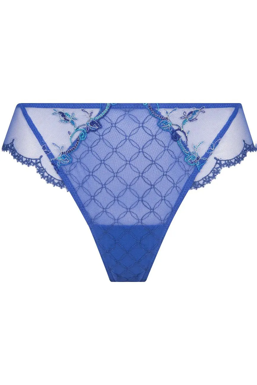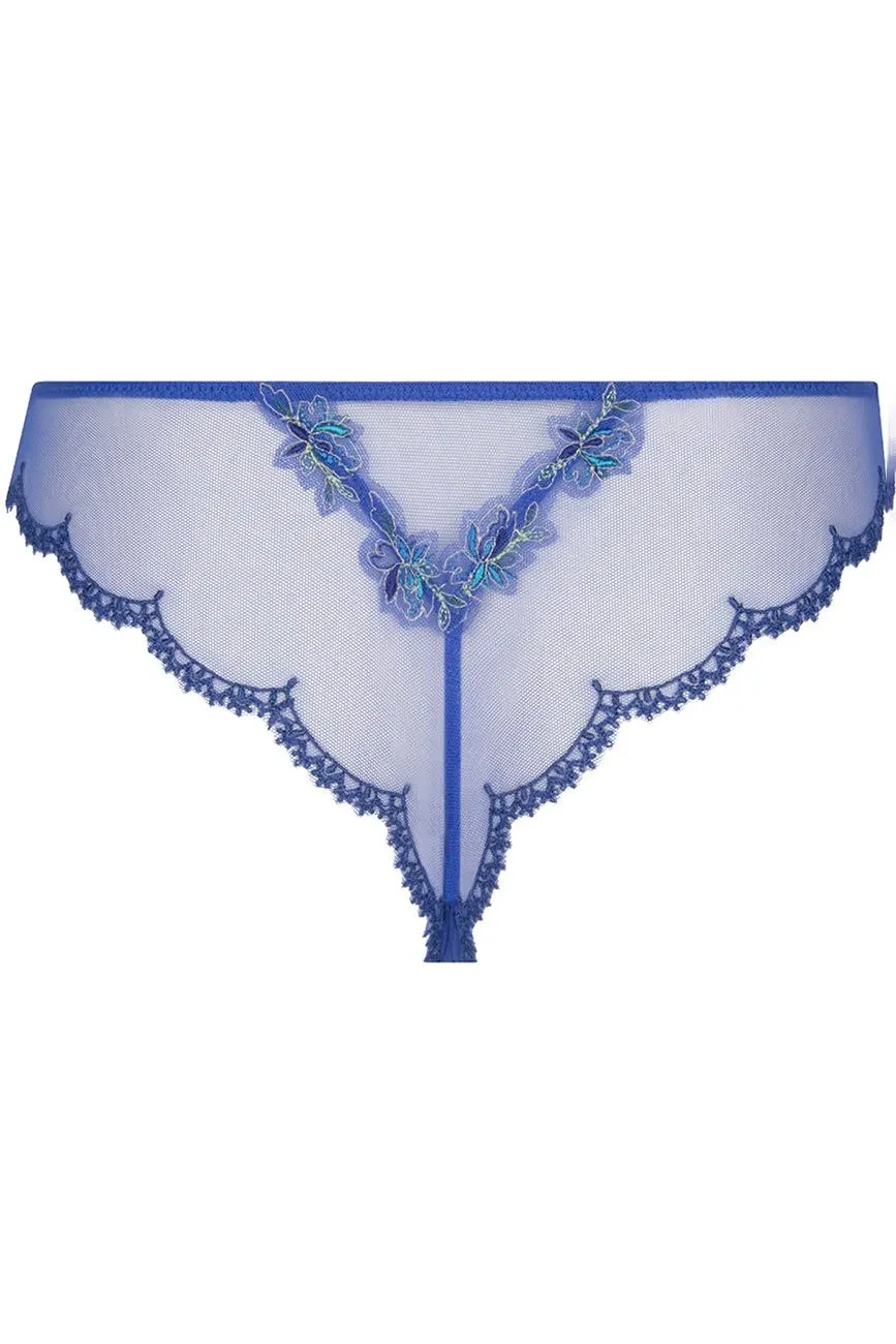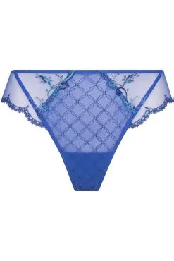 Frische Sinnlichkeit aus zartem transparentem Ornament-Mesh und besonders edler Calais Leavers Spitze in kräftigen Blau-Tönen. Der verspielte Sting-Tanga ist rundherum verspielt und reich verziert, mit Baumwollschrittfutter.