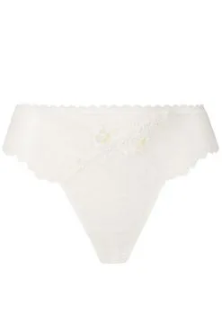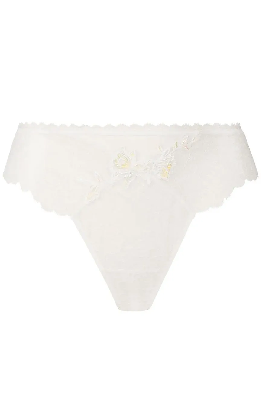Luxuriöser String-Tanga von Lise Charmel. Der mit besonders edlen BlĂĽtenstickereien verzierte String ist ganz aus prächtiger Calais Caudry-Spitze – herrlich sanft und weich auf der Haut. Perfekt auch als Hochzeits-Dessous.
