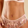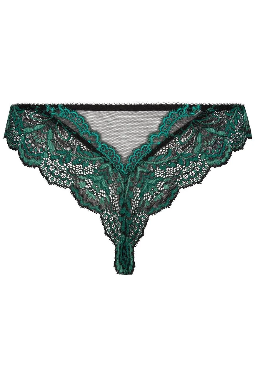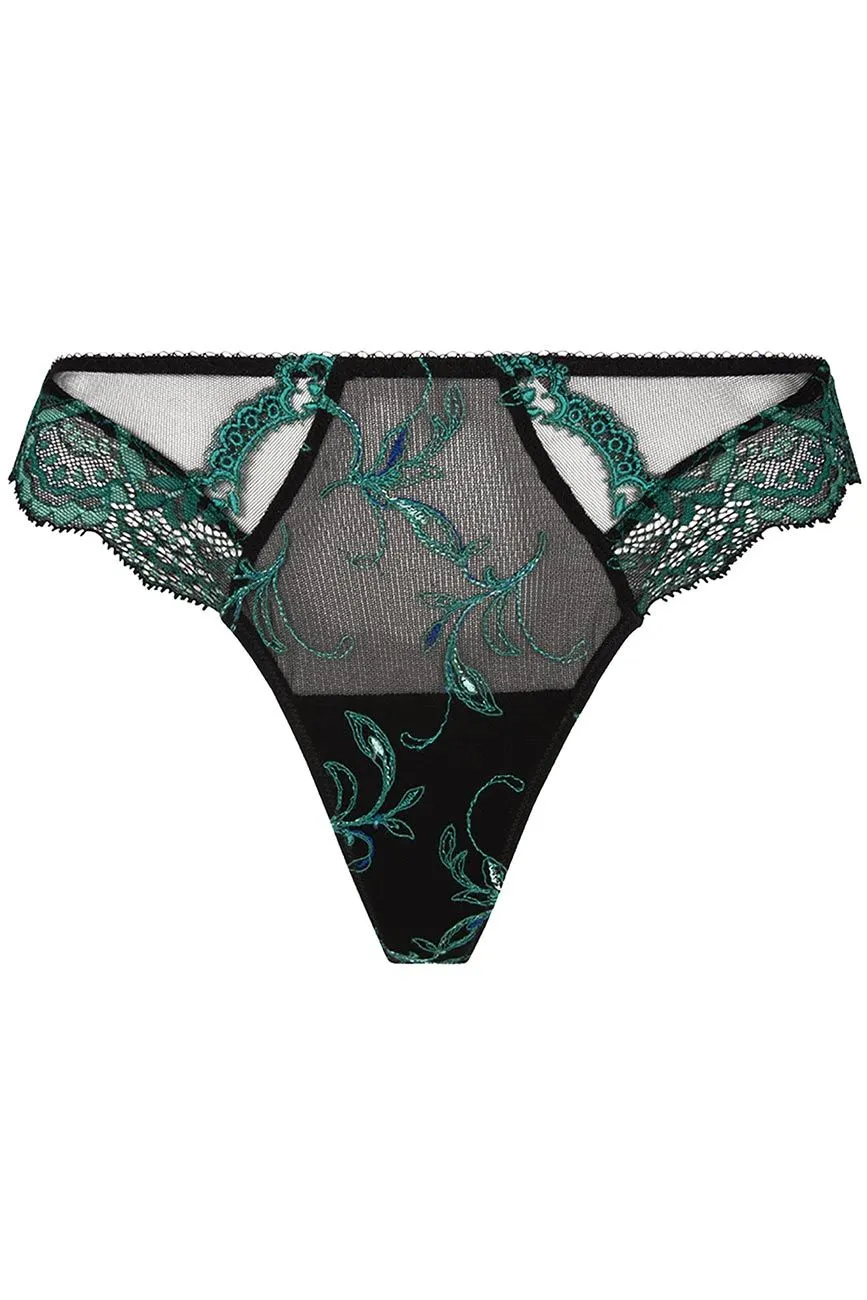 Edler String-Tanga von Lise Charmel. Das Material ist extrem feines, transparentes Gewebe mit wertvoller Stickerei in Smaragd und Blau verziert, weiche Spitze an den Säumen. Detailverliebte, geometrische Verarbeitung ist die höchste Kunst der Haute Couture.