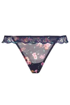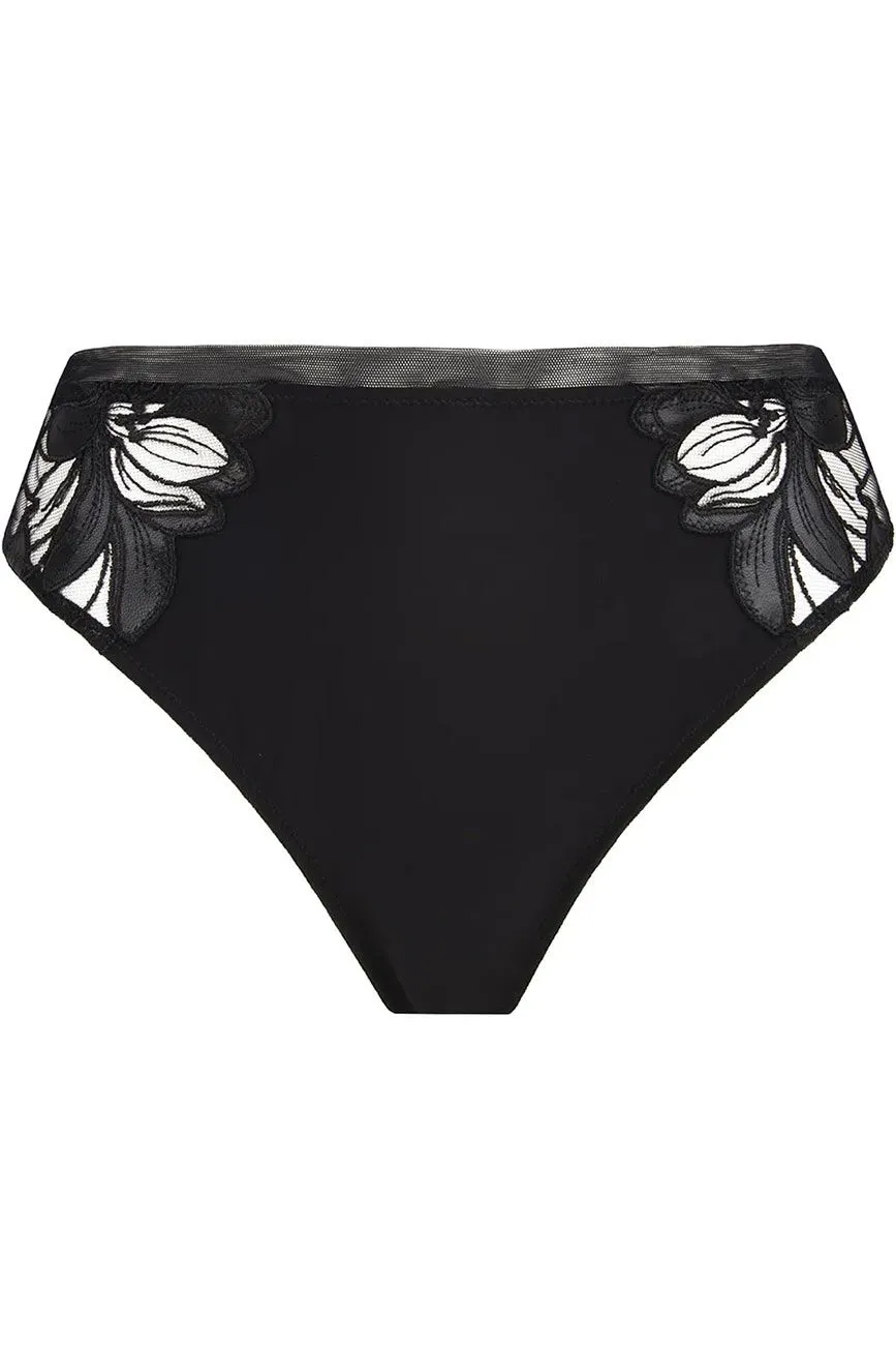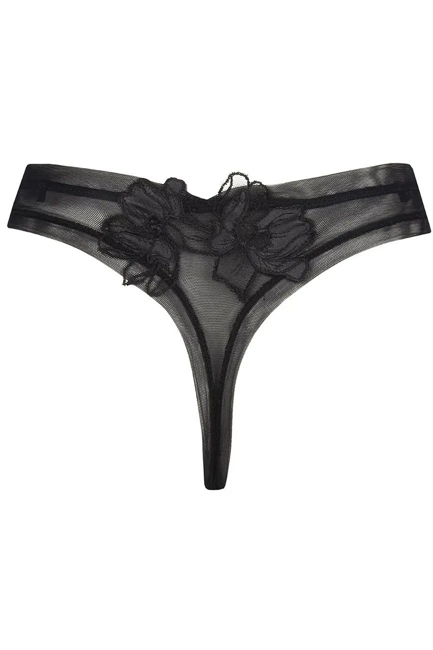 Extravagant – luxuriös – sexy: transparentes Mesh mit edler Blütenstickerei, die Blütenblätter sind aus effektvollem Lederimitat gearbeitet. String-Tanga, vorne aus weichem Microsatin, im Rücken aus Tüll und reich verziert.