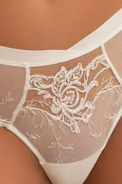 Edle Luxus-Creation von Lise Charmel mit wertvoller Fächerstickerei im Guipure-Stil. Edler String-Tanga mit sinnlicher Transparenz, vorne und hinten reich mit der wertvollen Stickerei verziert, Bund aus weichen, flachen und elastischen Satinbändern, Edle Swarowski-Juwelen-Details, Baumwollschrittfutter.
