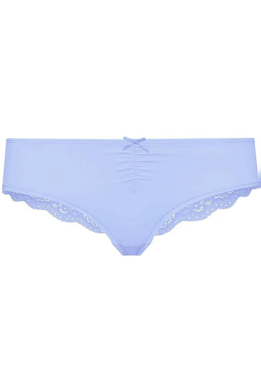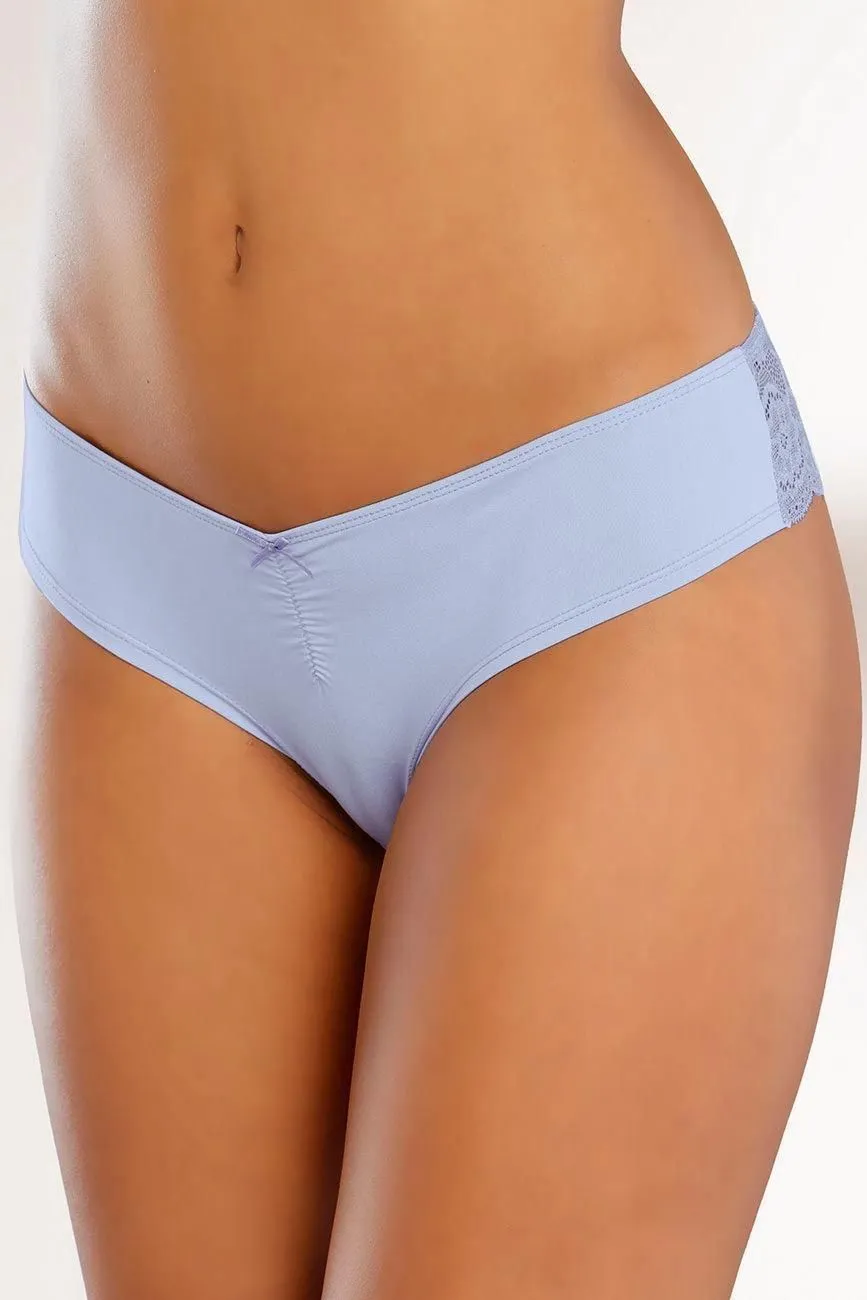 Brasilslip vorne aus weicher Microfaser mit leichter Raffung, hinten aus transparenter Blütenspitze, sowie kleiner Zierschleife vorne.