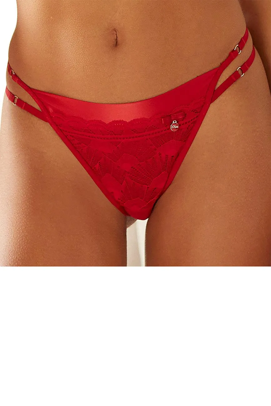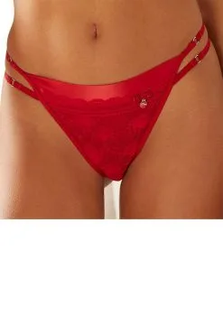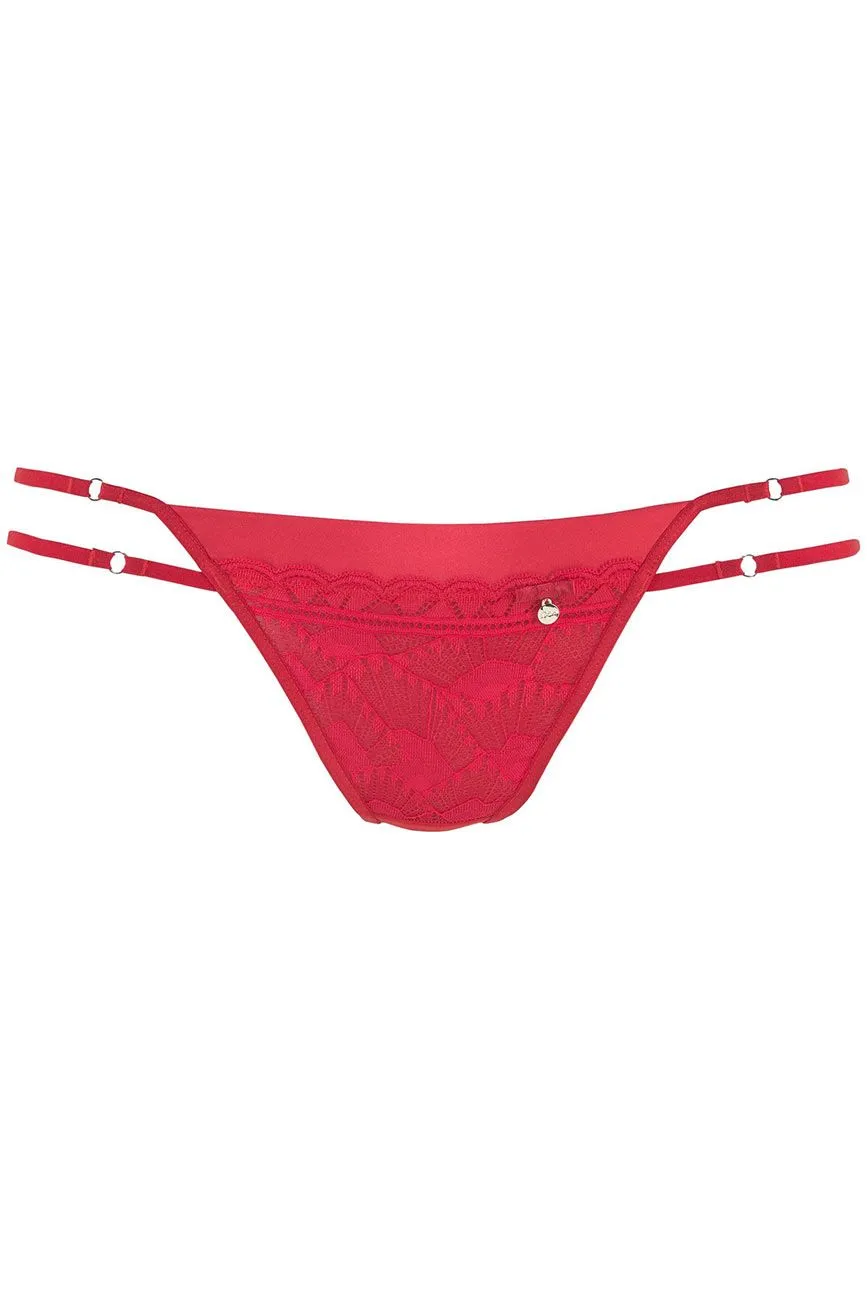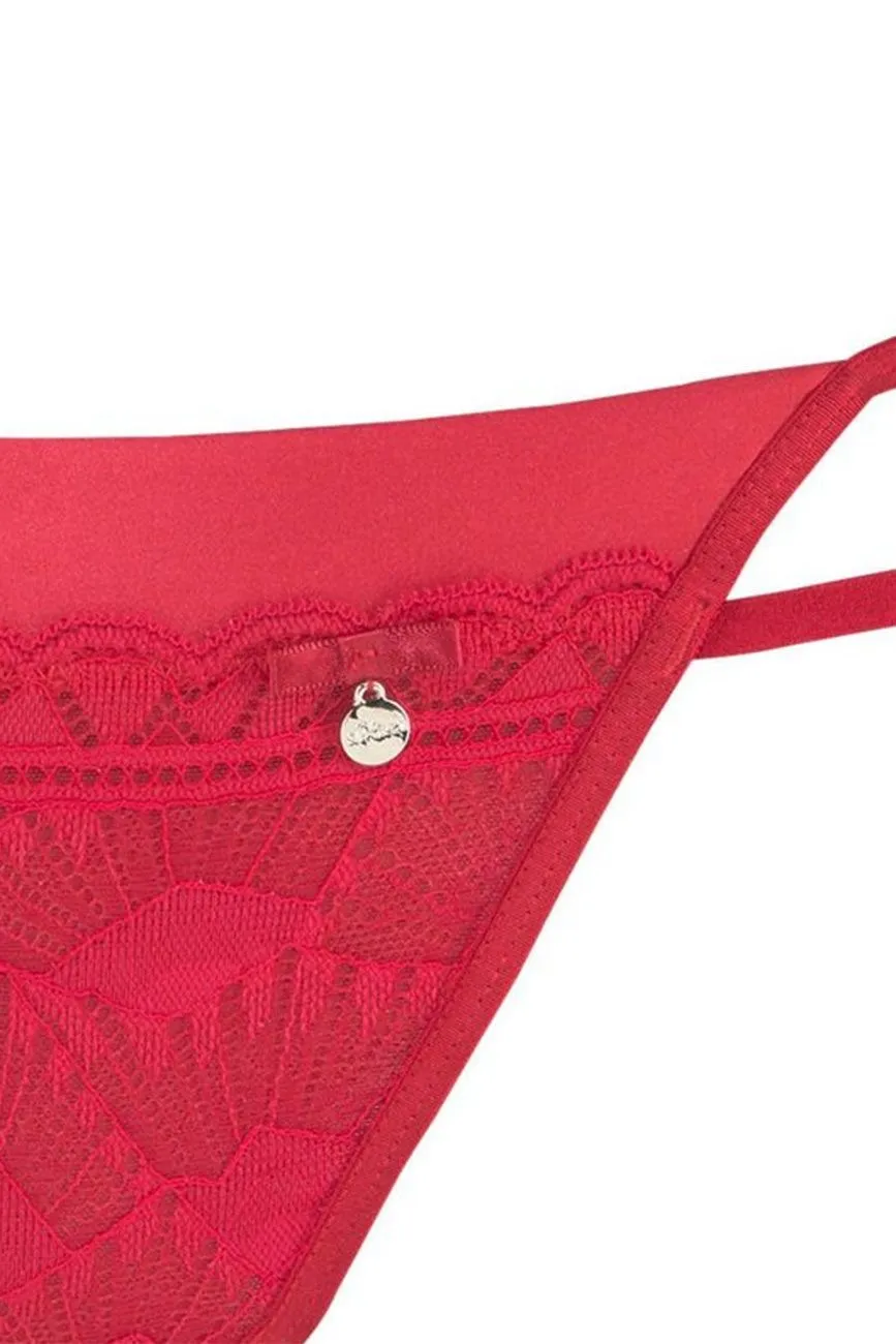 Sinnlicher String mit blickdicht unterlegter Spitze von s.Oliver. Mit modischem Metallaccessoire an der Seite. Seitlich mit extravagantem Bänder-Look. Mit eingearbeitetem Baumwollzwickel.
