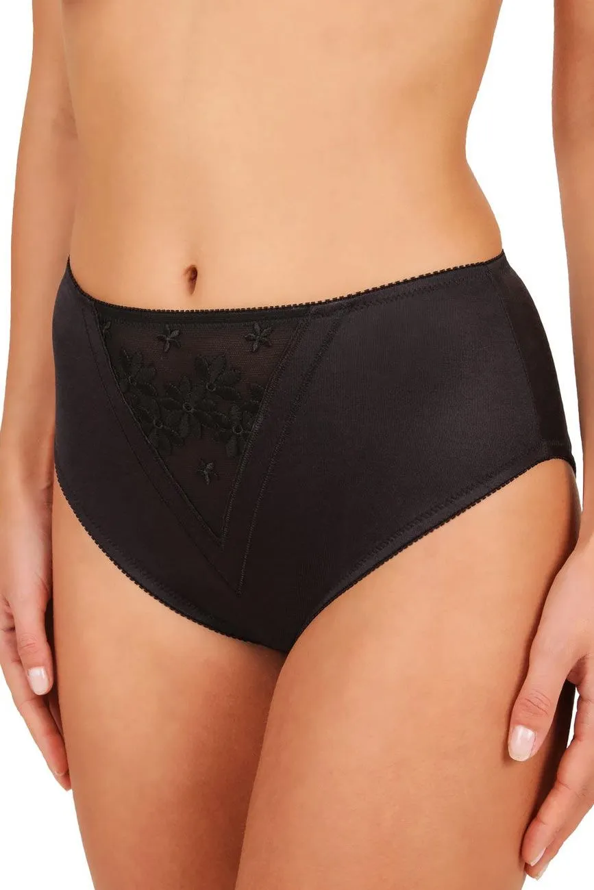 Dieser Bauchbedeckender Taillenslip kaschiert Vorteilhaft die Silhouette. Durch die softe Microfaser mit Baumwollanteil trägt sich dieser Slip besonders bequem. Einsatz aus Schweizer Blumenstickerei in der vorderen Mitte. Perfekter Sitz und hoher Tragekomfort am Beinausschnitt, durch elastische und weiche Beinausschnittbänder.